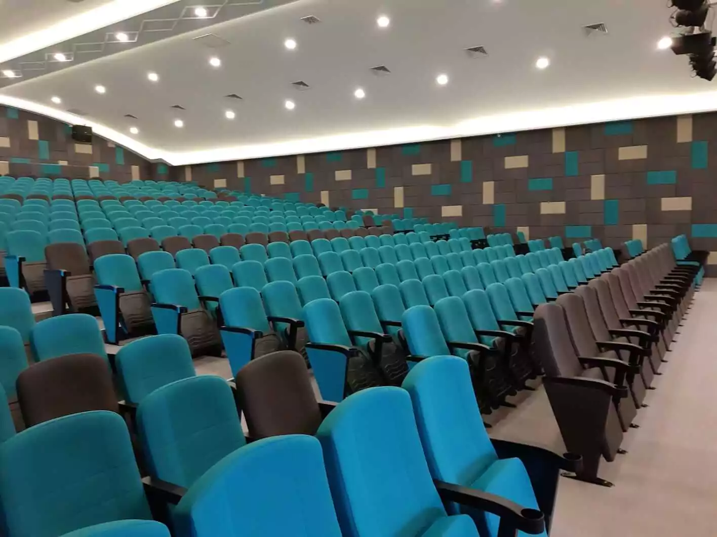 High-quality seats, manufactured to meet European standards and installed in a modern lecture hall.